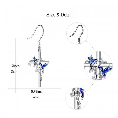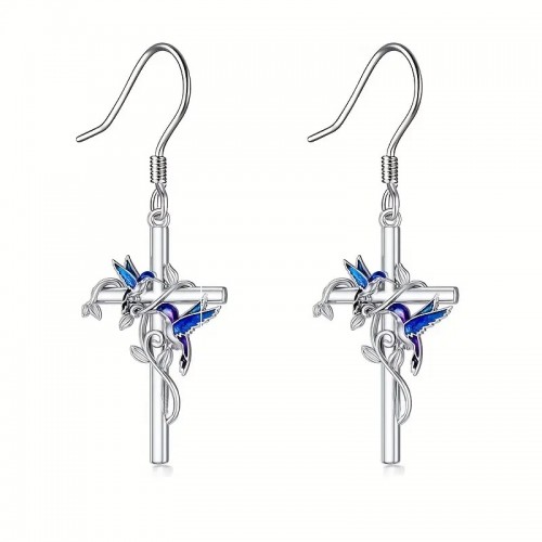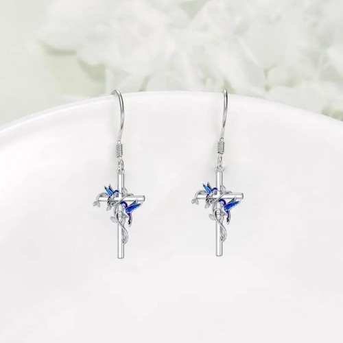 블루 허밍버드 덩굴 장식 십자가 귀걸이
